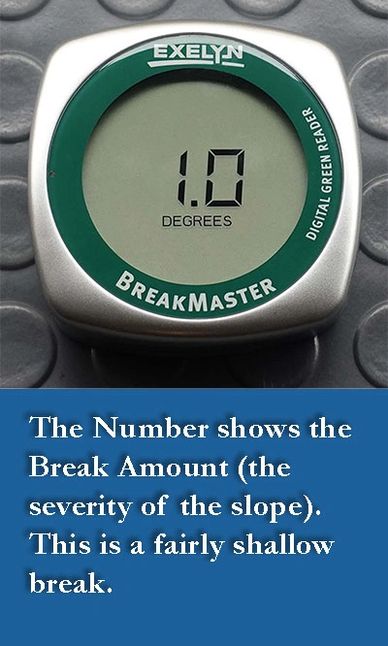 But once you’re on the green SLOPE (or the BREAK of the green) is everything. The BREAK affects how your ball rolls to the hole. No greens are flat. They all slope to some degree to allow water runoff. But unlike distance, BREAK is not so easily seen. Without a BreakMaster (which tells you BREAK DIRECTION and BREAK AMOUNT) you’re just guessing.
